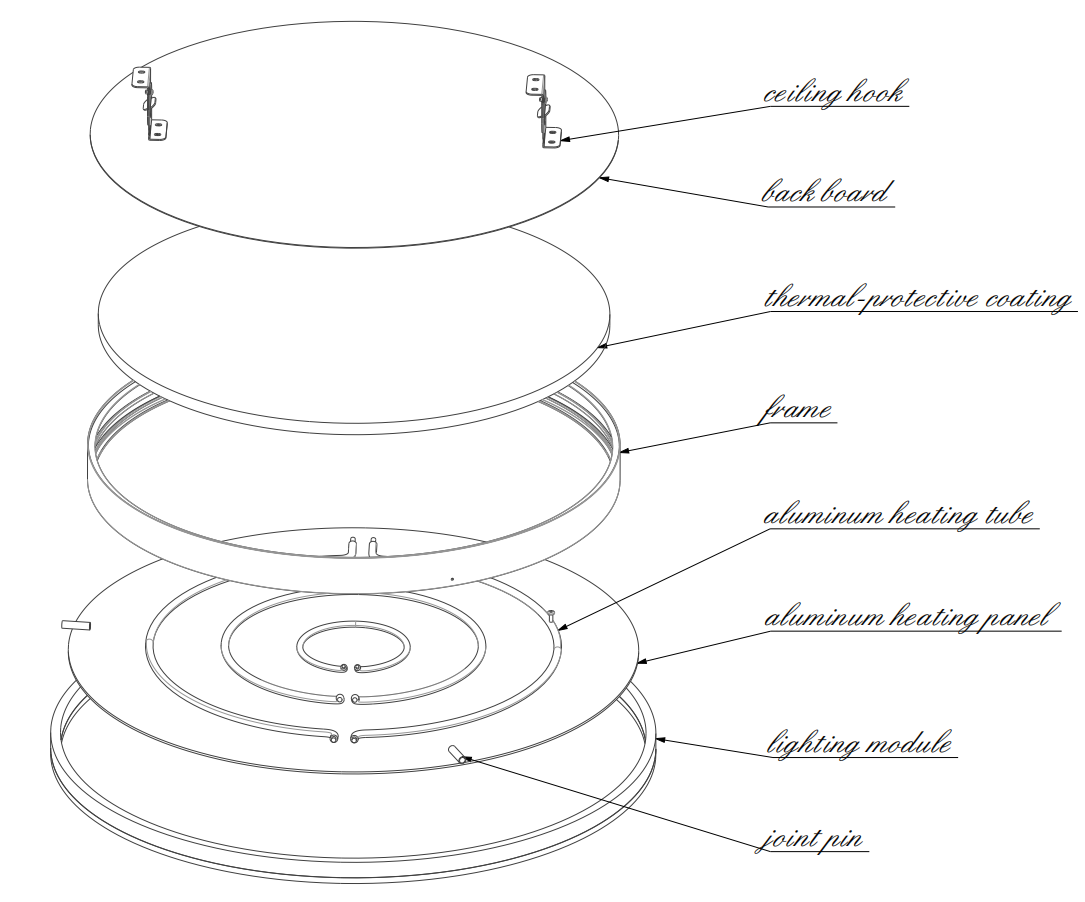 The current trend in the heating market emphasizes health and comfort, energy efficiency, aesthetics, and convenience. Existing heaters are generally space-consuming and unattractive, which use the convective and near-infrared heating mothods perform poorly in terms of comfort and health. This product is designed to be both heating and lighting, which can replace the ceiling lamp without occupying additional space with better style. The heating method is far infrared radiation,which directly heats objects below and then objects release heat. The heating effect is gentle, uniform and greener.