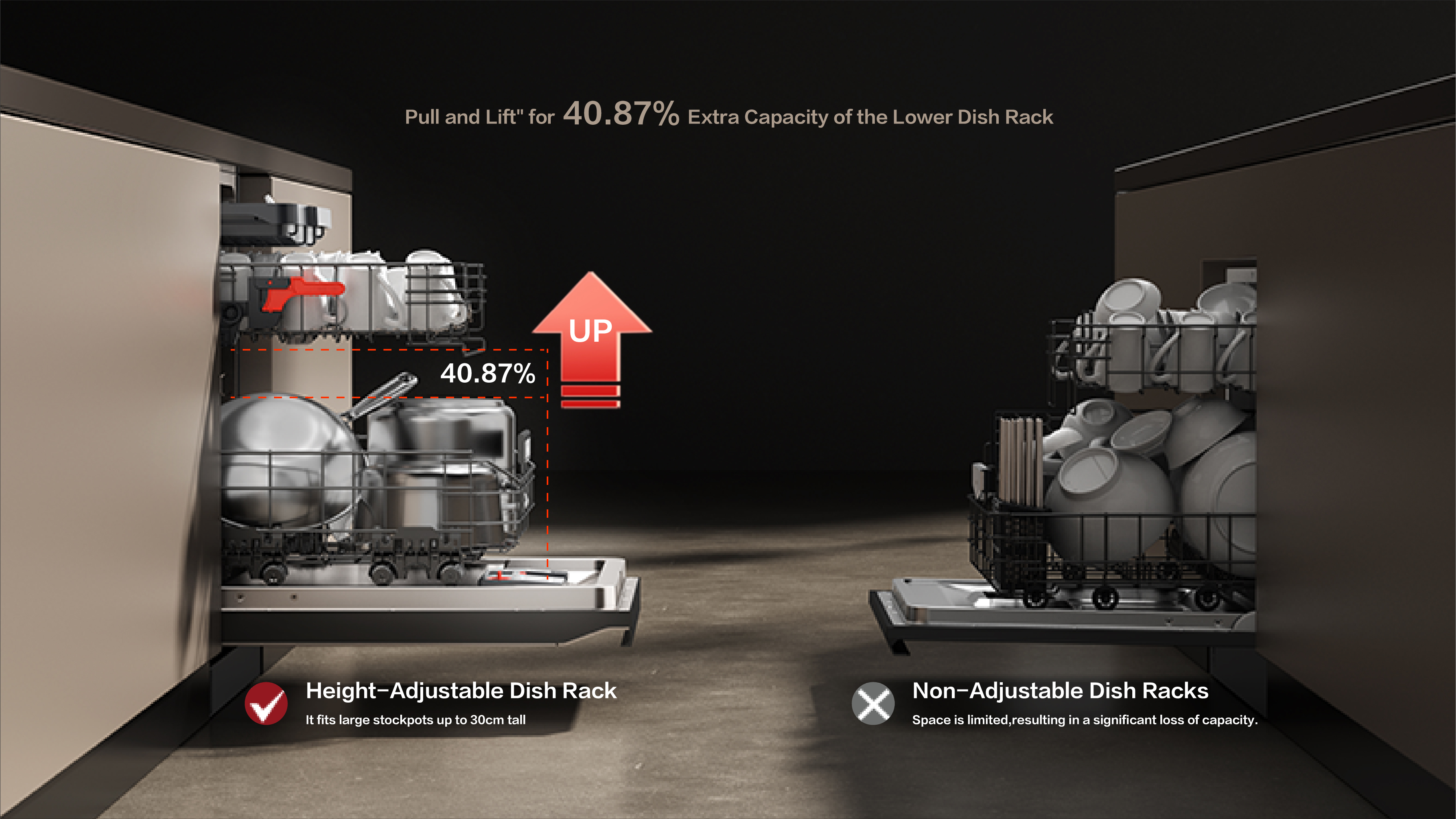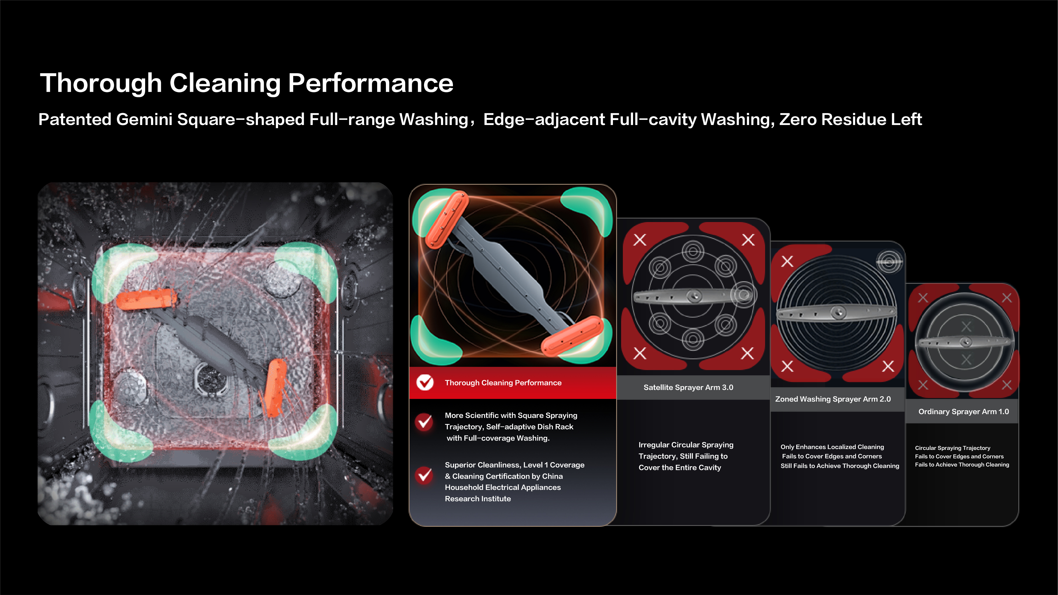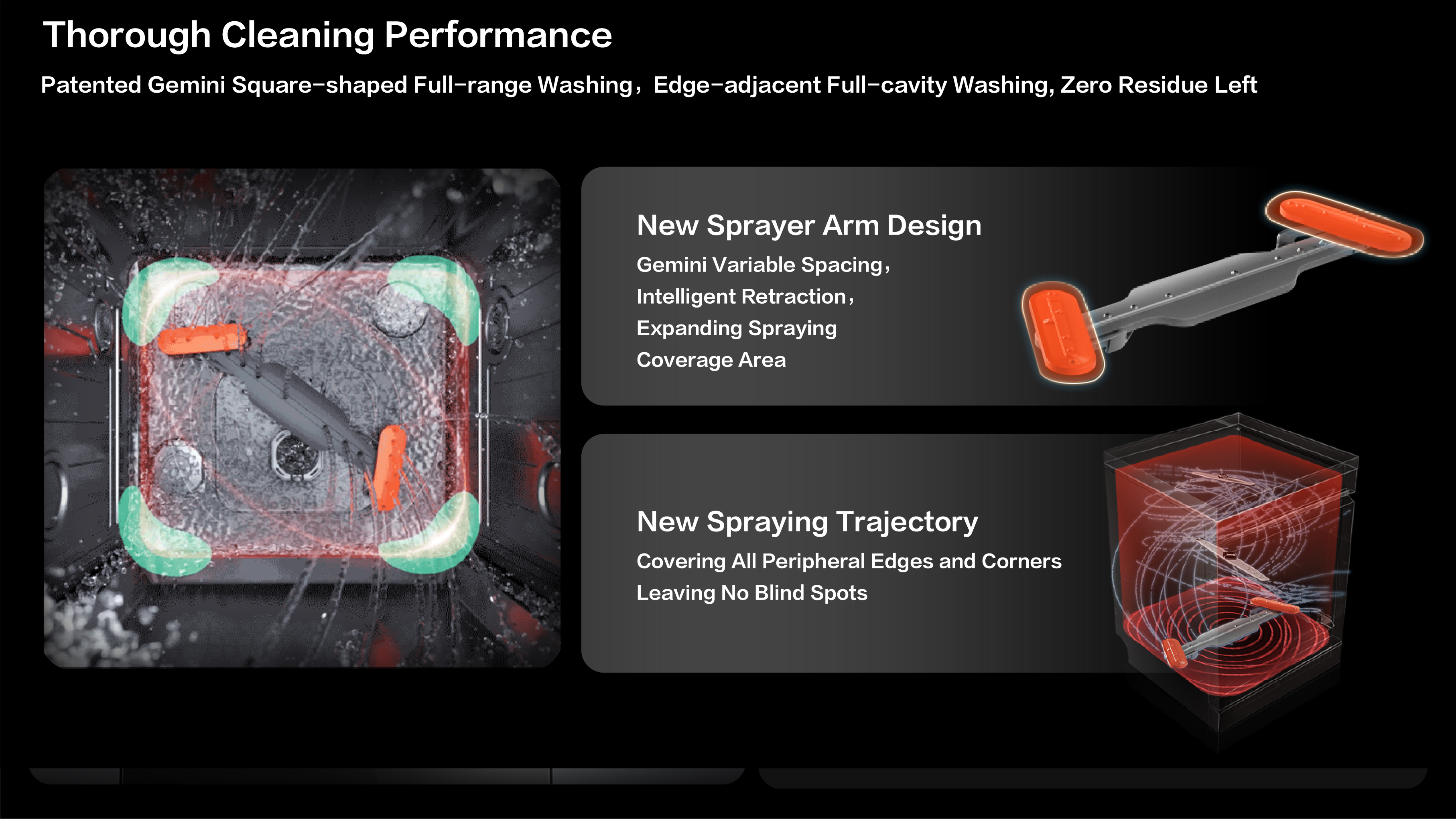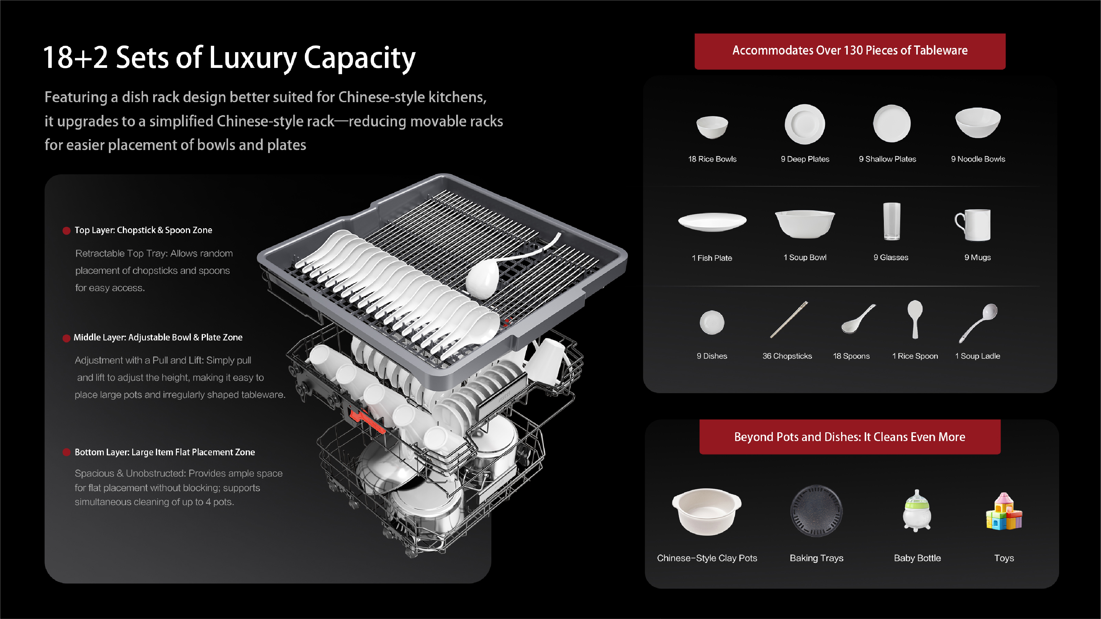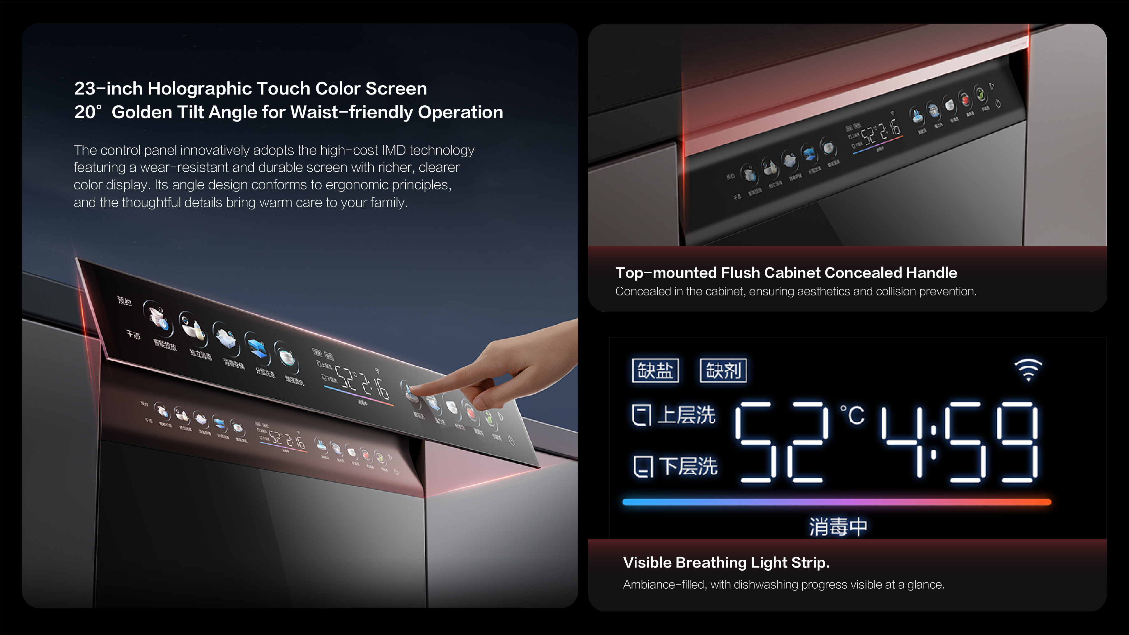 Superior Cleaning: Dual retractable spray arms with square trajectory ensure full coverage,certified for excellent cleaning performance.User-Friendly: 23" tilted touchscreen and smart app allow intuitive control and cycle monitoring.Light and voice notifications enhance experience.Seamless Integration: Flush design with frameless glass blends into cabinets.Integrated handle offers clean aesthetics.Eco-Efficient:Inverter motor cuts energy use by 15% versus top standards. Auto detergent dispensing reduces waste.Spacious & Adaptable: 18+2 place settings with adjustable racks fit various cookware.